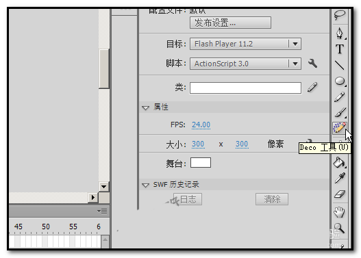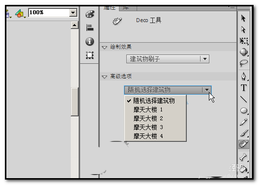 2、FLASH CS6为我们提供了一个很强大的工具,Deco工具,用这个工具,我们可以刷出很多的图案。比如,高楼大厦。