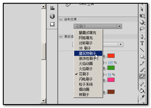 4、在下拉菜单中点:建筑物刷子,然后,再点开:高级选项,选择其中一种建筑物
