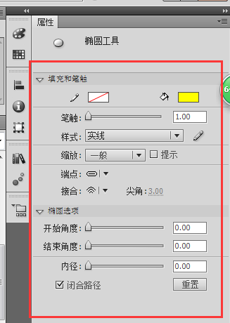 3、选择工具栏中的椭圆工具,找到椭圆工具属性设置窗口,在属性设置中根据要求进行一些属性的设置,我这里只改了“笔触颜色”和“填充颜色”,笔触颜色改的是无,填充颜色改的是黄色。