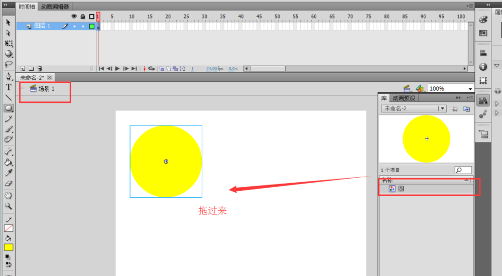 5、返回场景1,打开“库”窗口,选择“选择工具”,将库中我们创建的圆这个元件图形拖动到场景之中。