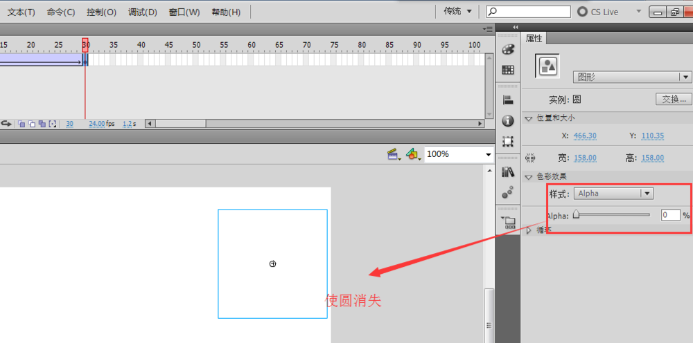 7、将时间轴定位在第30帧的位置上,然后选中圆这个图形元件,在右侧的属性设置窗口中选择色彩效果里面的Alpha,然后将其数值改为0%,这个时候我们发现这个圆就消失了。