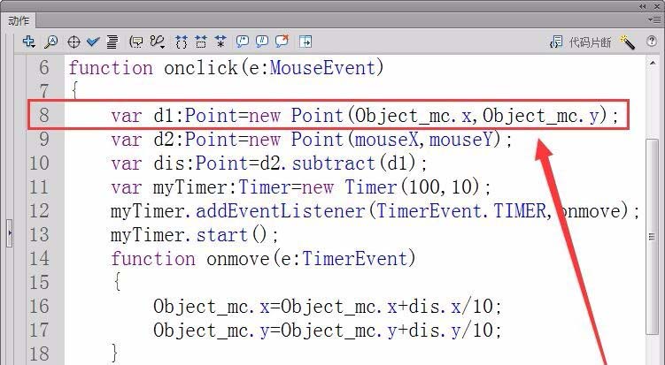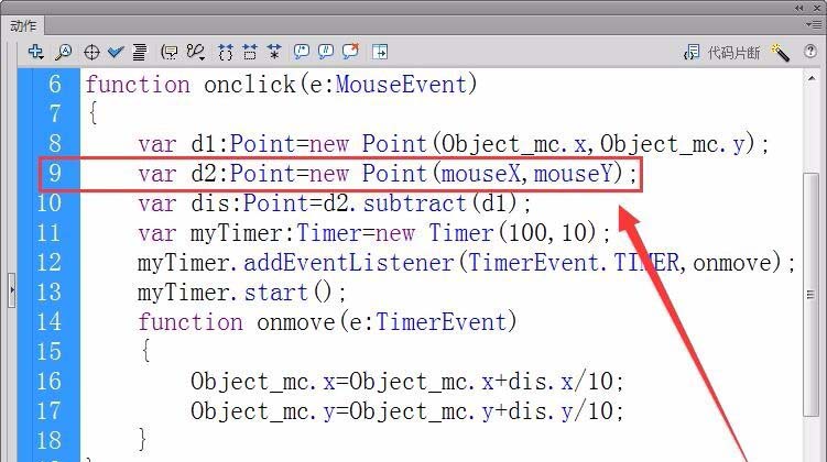 4、定义一个Point类的变量d1,用来表示对象Object_mc的X轴和Y轴坐标。