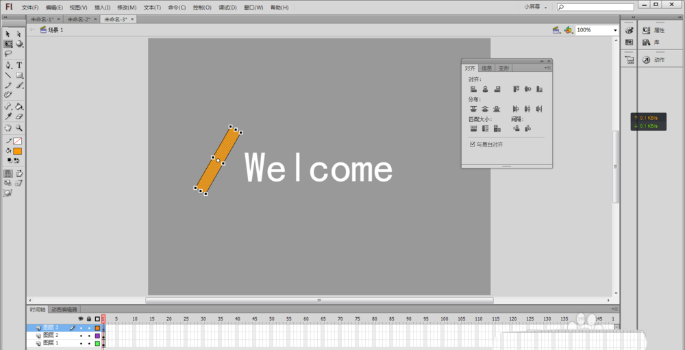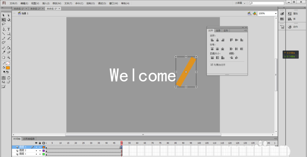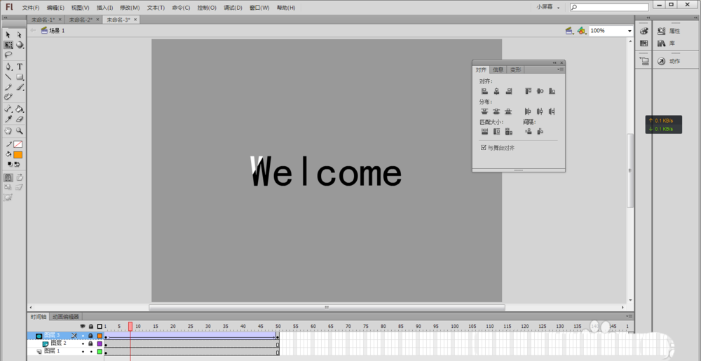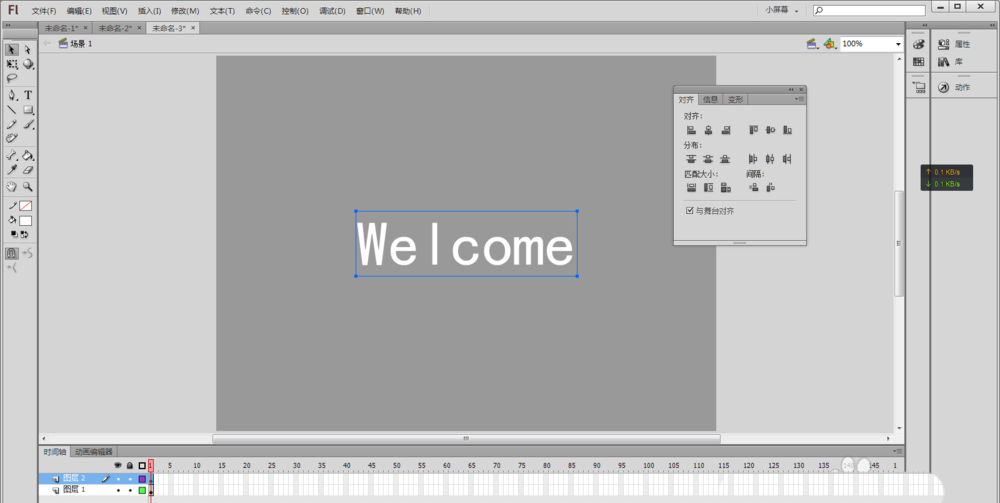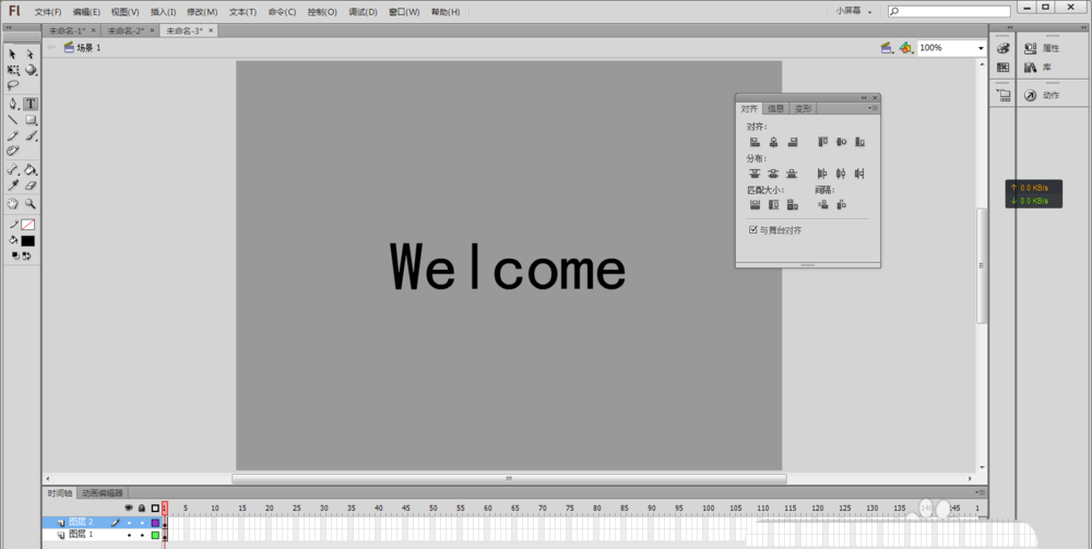 2、用鼠标选择文本工具(或者按快捷键T),在舞台中央输入Welcome(或者自己想实现效果的文字),并在“属性”中将文字颜色设置为黑色,使用鼠标选择工具箱中的选择工具(快捷键V)选择舞台上刚输入的文字,然后按快捷键Ctrl+K,让选中的文本“水平中齐”和“垂直中齐”