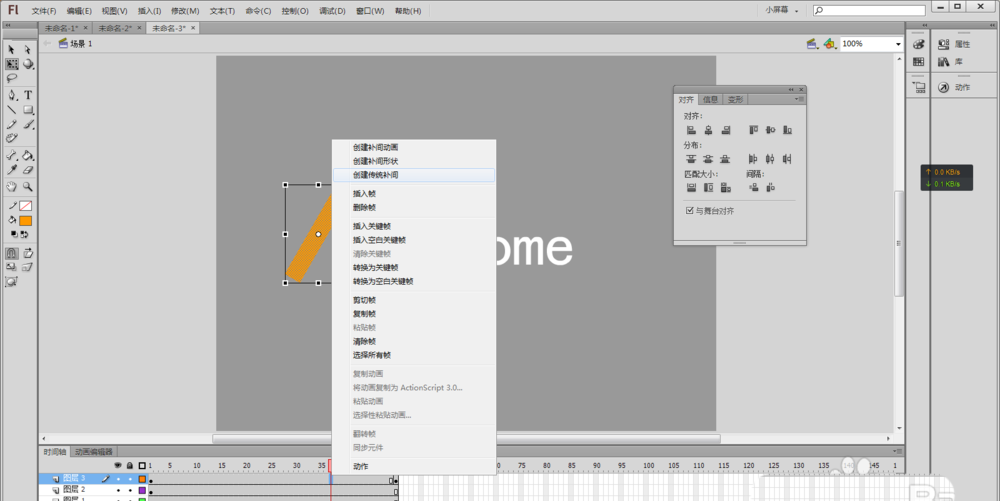 7、然后在矩形图层中点击两个关键帧中的任意位置,单击鼠标右键选择添加“创建传统补间 ”。