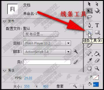 1、新建文档,再在舞台最右侧的工具箱中选择线条工具,也可以按N键。调出线条工具。