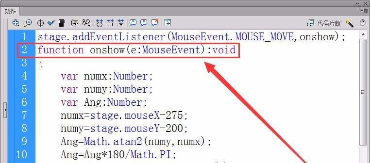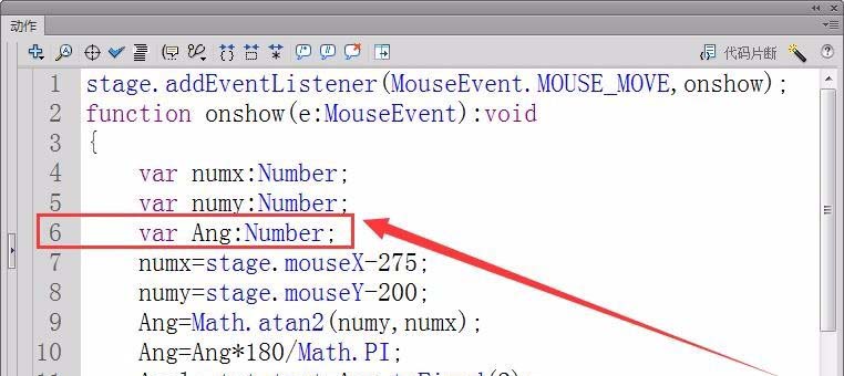 9、用反正切函数Math.atan2计算出鼠标相对于舞台中心的角度,保存在变量Ang中。