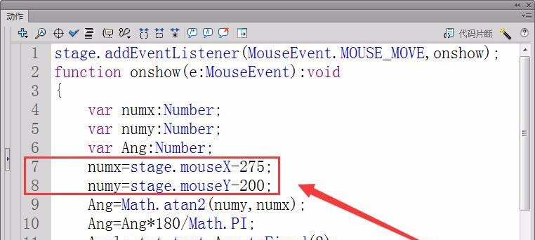 6、定义两个实型变量numx和numy,用来存储鼠标相对于舞台中心的坐标。