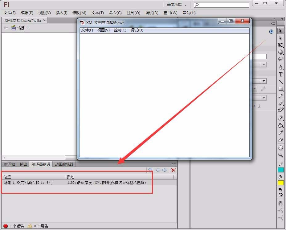 5、当在节点中,书写一个错误的节点头部时,运行程序会提示错误,这是因为节点内部的文档被解析了。