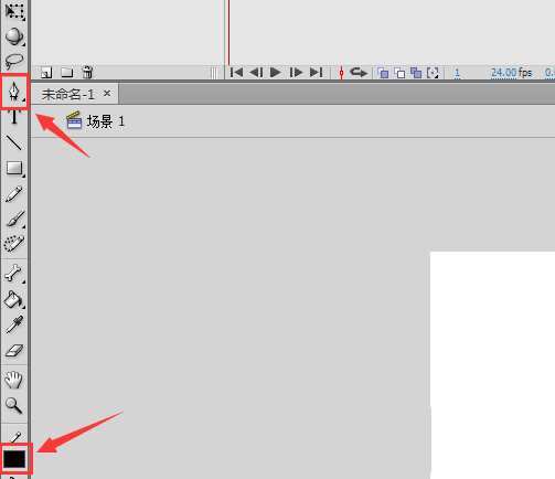 1、首先我们双击flash的快捷图标,将这款软件打开,打开flash之后在打开的界面内找到钢笔工具,同时设置钢笔的颜色为黑色,如图所示: