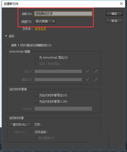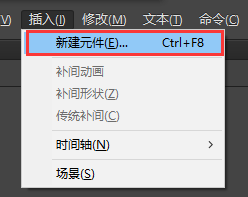 2、选择菜单栏中插入菜单,选择新建元件命名,弹出新建元件窗口,选择新建一个影片剪辑元件,元件命名为“四色跳动文字”,然后点击确定进行创建。
