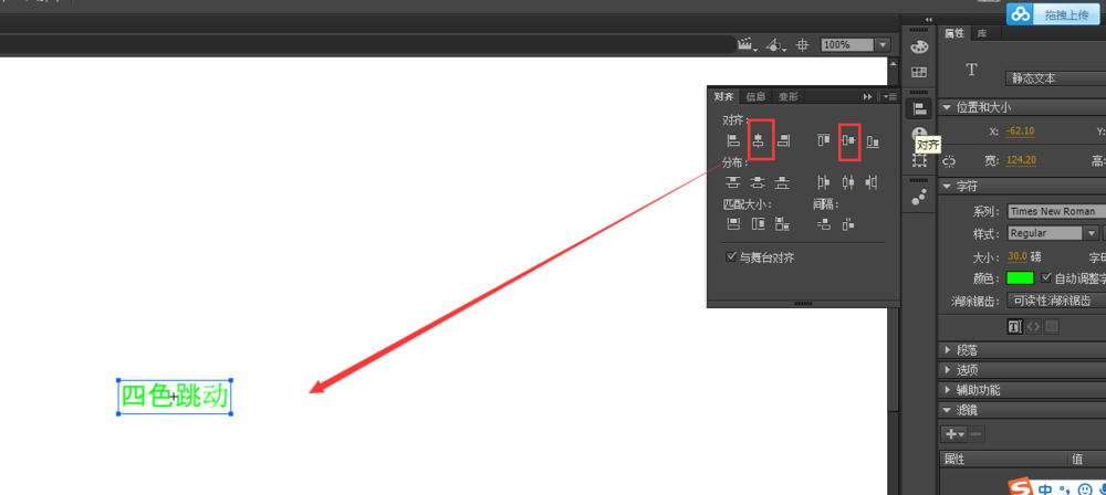 3、选择工具栏中文字工具,在影片剪辑中输入文字“四色跳动”四个字,然后打开对齐窗口,设置水平对齐与垂直对齐。