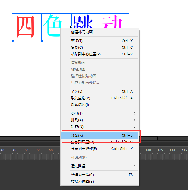 5、选中文本内容,右键选择分离,将其分离为四个单个文本;然后在依次选中四个单个文本,右键选择转换为元件,将四个单独的文本都转换为图形元件。