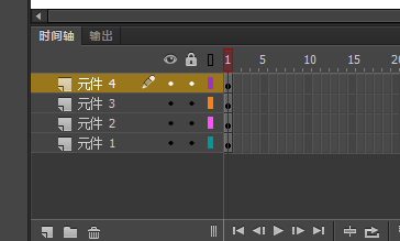 7、选中元件1图层,在第5帧与第10帧的位置按F6各插入一个关键帧,鼠标定位到第一帧位置,将元件1文字向上移动一定位置,在定位到第5关键帧位置,将文字在垂直向下移动一定位置;统一的在四个图层的第50帧位置按F5插入空白帧;其他三个图层也一样,不如说元件3图层,在第10帧,15帧与20帧位置插入关键帧,在第10帧位置将文字垂直向上移动一定位置,在第15帧将文字垂直向下移动一定位置;其他两个图层以此类推。