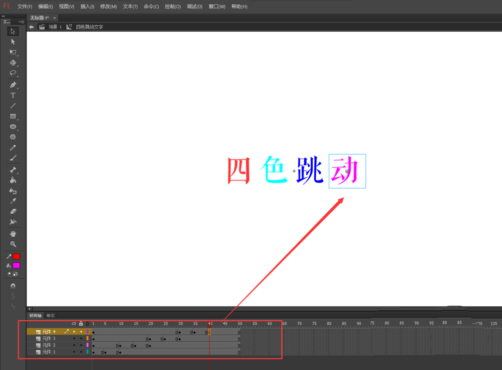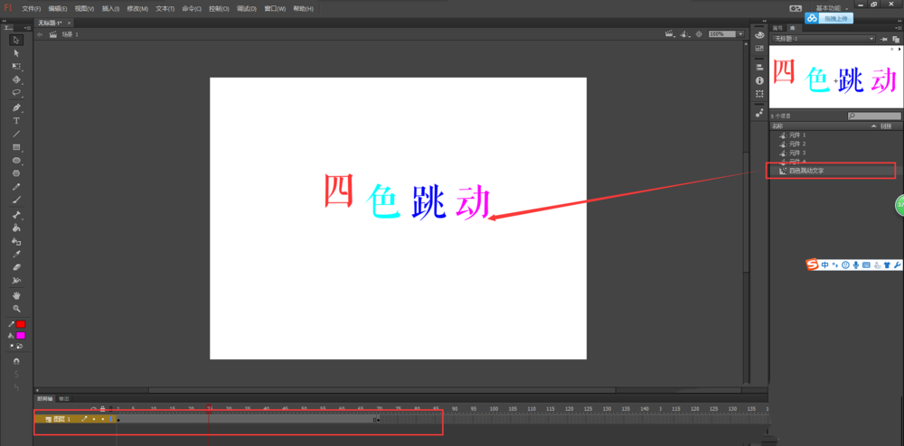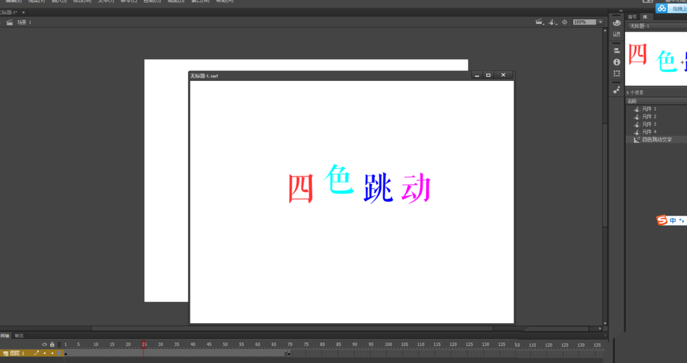 8、单击场景返回到场景画布中,打开库窗口,将影片剪辑元件“四色跳动文字”拖入到画布中,然后Ctrl加回车键,到处播放预览动画,一个四色跳动的文字的动画就制作出来了。