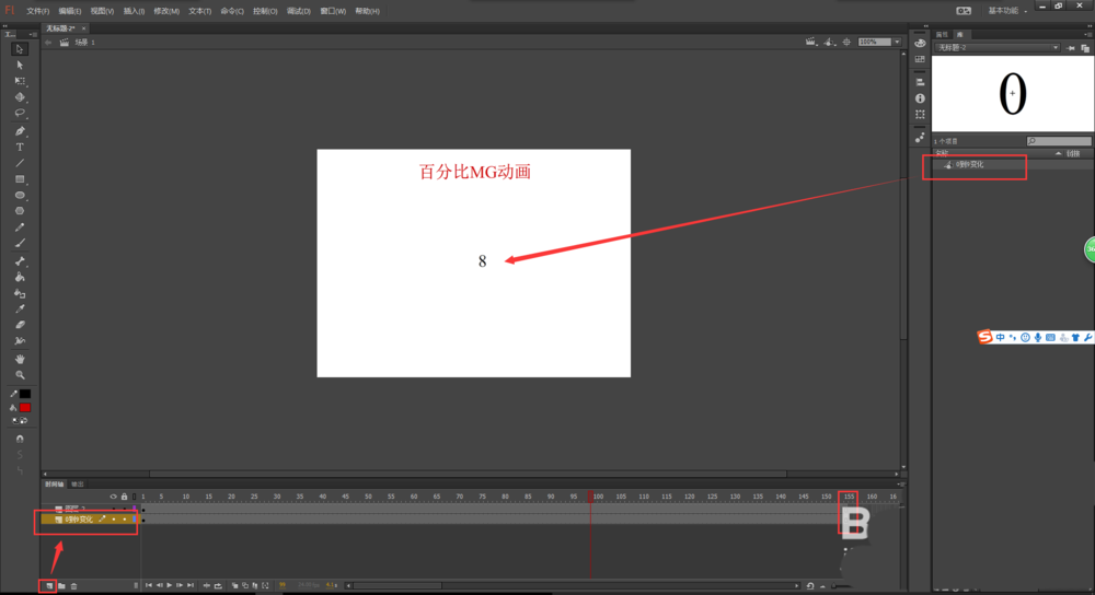 4、单击返回场景,新建一个图层,将该图层命名为“0到9变化”,然后打开flash中库窗口,将元件“0到9变化”拖入到画布中,在图层1和新建图层时间轴的第155帧位置按F5创建一个空白关键帧。这个时候按回车会看到只是0到9的循环变化。