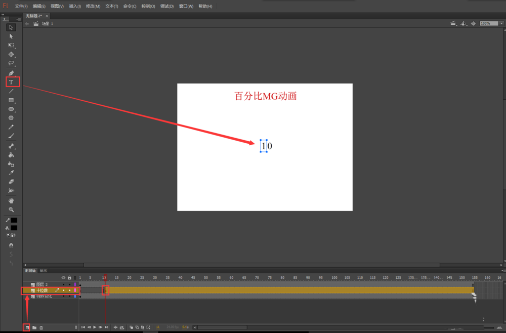 5、在时间轴窗口中在新建一个图层,命名为“十位数”,然后在第十一帧位置按F6插入一个关键帧,用文本工具输入数字“1”,用选择工具移动到合适位置;然后以此类推,每隔十个关键帧就插入一个关键帧,并将文本内容改为2到10.