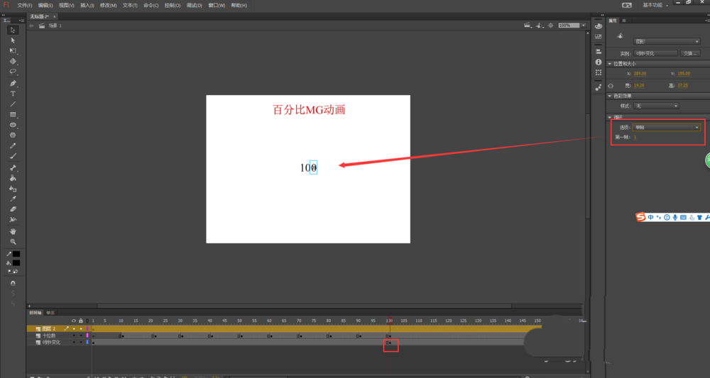 6、做完上一步之后,我们按回车键会发现到了100之后,最下方的各位数图层依然在0到9变化,所以选中“0到9变化”图层,在该图层第100帧的位置插入一个关键帧,打开属性窗口,单击个位数数字,这时候属性窗口中会出现循环命名,将循环选为“单帧”。