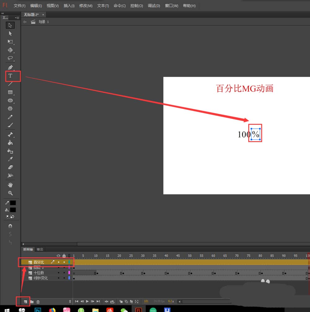 1、打开flash软件,新建一个flash项目,用文字工具在画布上方写上“百分比MG动画”。