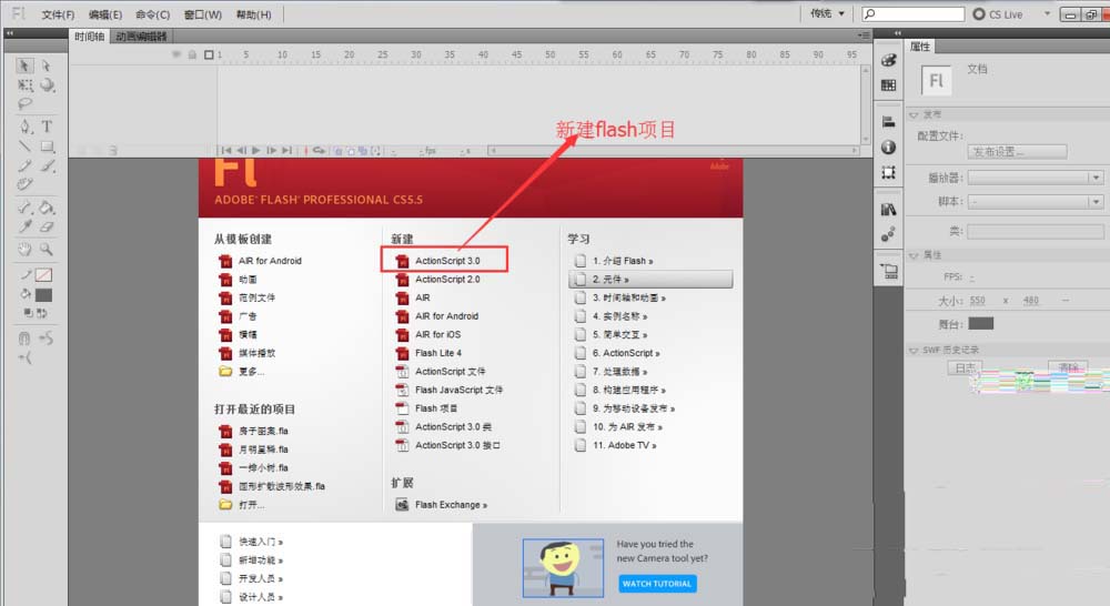 1、打开flash二维动画制作软件,选择新建一个flash项目,进入场景编辑。