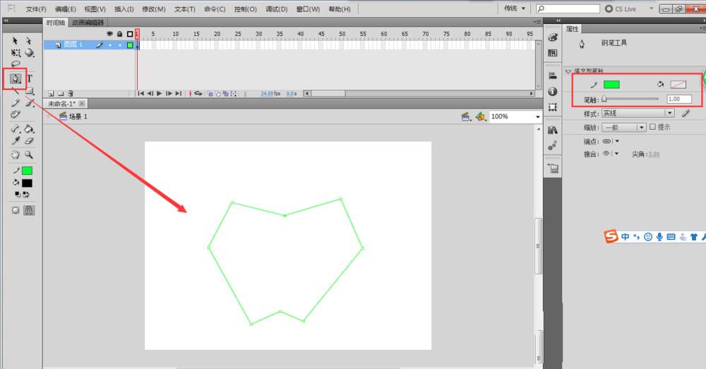 2、选择工具栏中的钢笔工具,在中间的场景区域用钢笔工具绘制出一个苹果的大致轮廓。