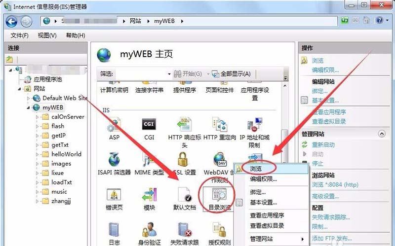 1、打开IIS,在“目录浏览”上右击,打开服务器所在文件夹。