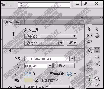 2、界面的右侧是工具栏,在这里调出文本工具;这时,会显示出文本工具的属性面板。