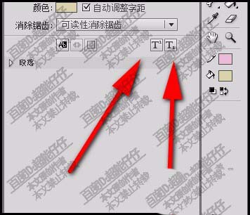 3、在这面板中,如下图箭头所指,这里有两个按钮,一个是上标,另一个是下标。