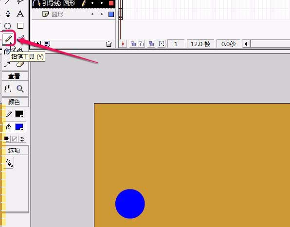 6、保持“引导线:圆形”图层为被选中状态,在舞台上用铅笔工具绘制一条曲线。