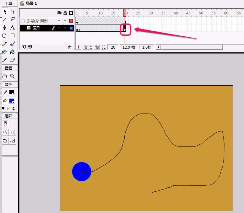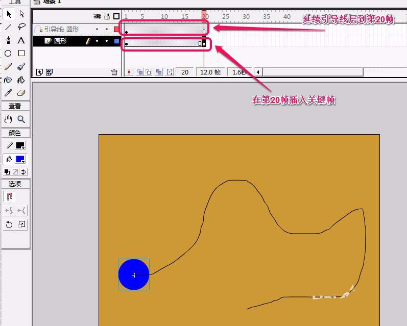 8、将“引导线:圆形”图层帧数延续到第20帧。在“圆形”图层第20帧插入关键帧。