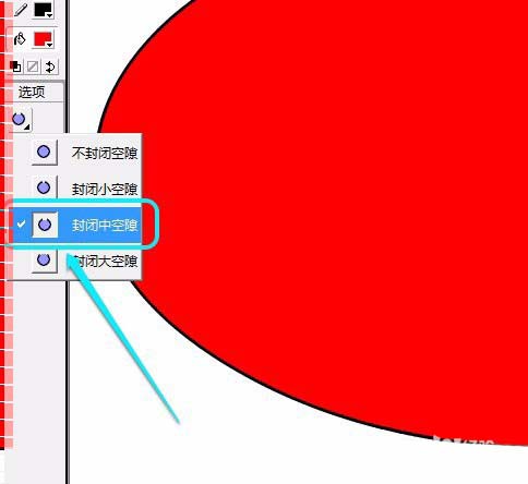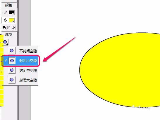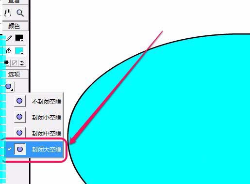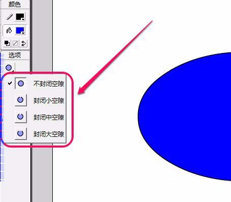 3、这时,工具栏下方出现了“颜料桶工具”“空隙大小”模式选项。软件默认选择“不封闭空隙”。下面来看看这几种模式的使用方法。