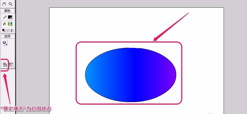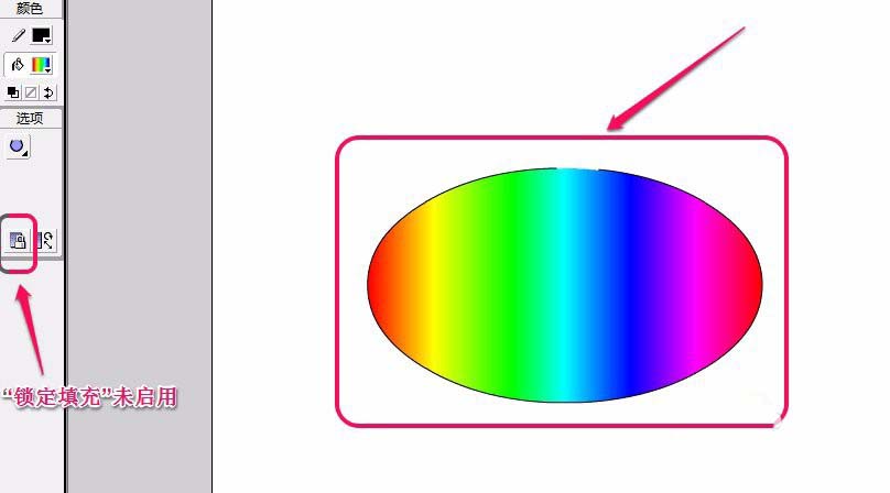 7、如图,此时“锁定填充”未启用,整个彩虹色就全部被填充到了椭圆里面。