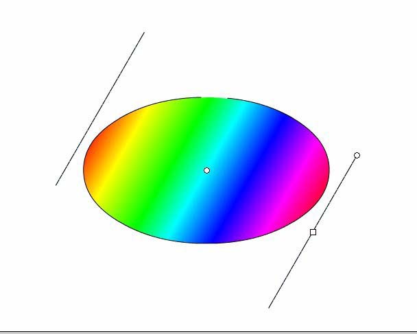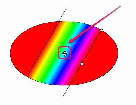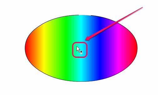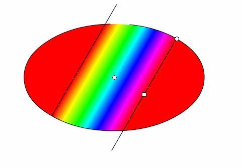 6、如图,当“锁定填充”功能为启用状态,使用颜料桶工具对椭圆进行填充时,图形的内部填充色并没有显示全部彩虹色,只显示彩虹色在整个舞台中间部分颜色。也就是“锁定填充”是指:以整个舞台为填充对象,舞台中的图形只显示自己所处位置的舞台中的局部填充色;当“锁定填充”未启用时,就以图形为对象,填充整个所选择的颜色范围。