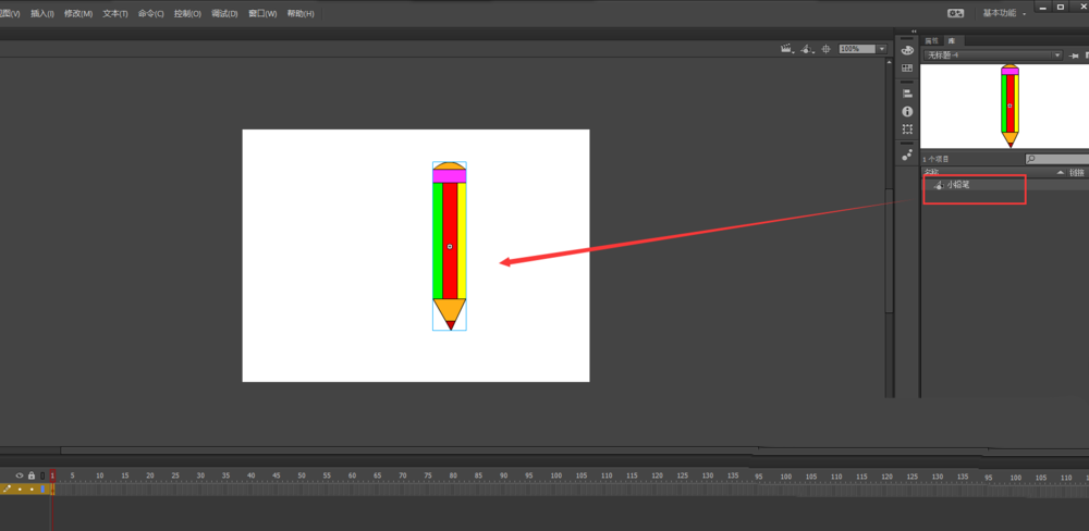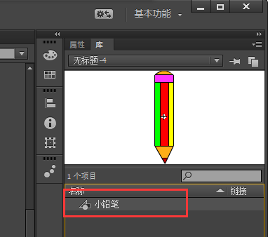 2、将小铅笔图形元件直接复制粘贴到flash软件的库中,在将小铅笔图形元件拖入到场景的舞台中。