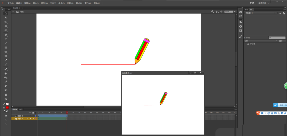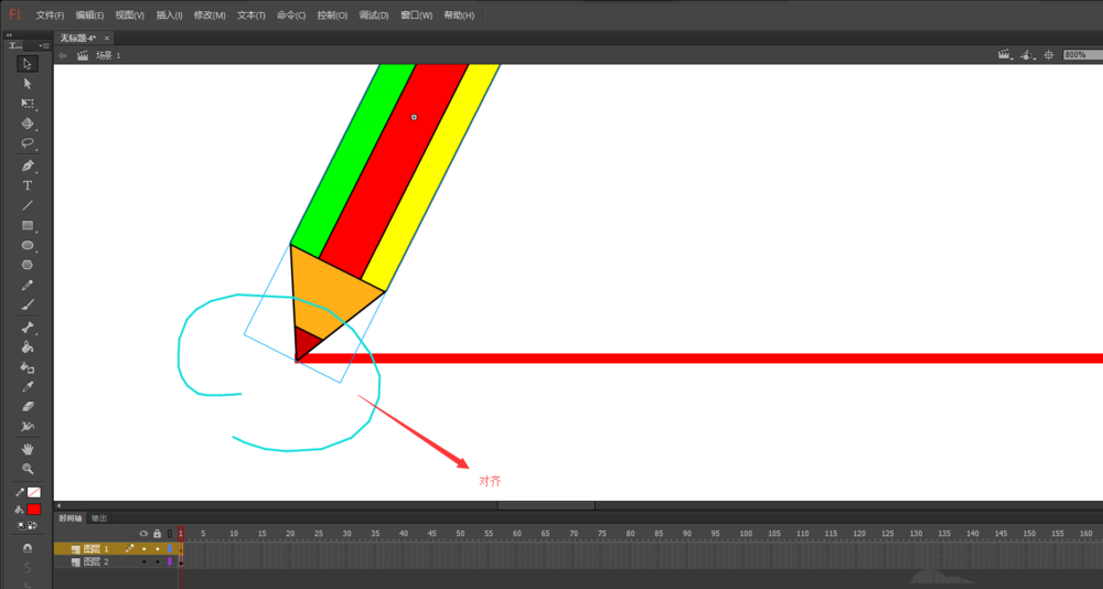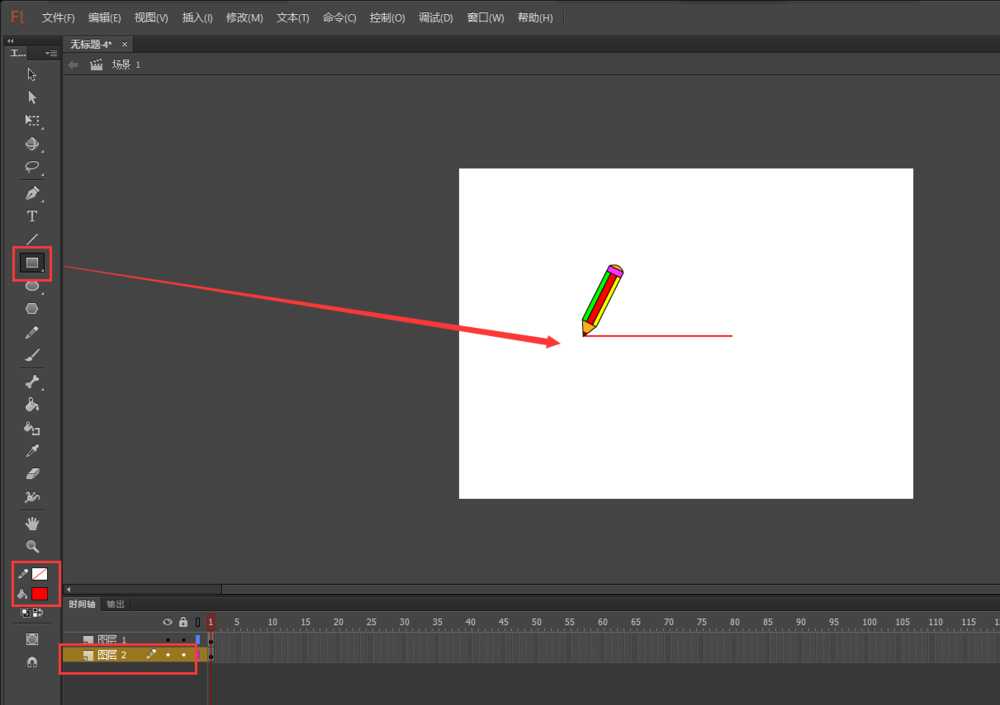 4、新建一个图层2,将图层2移到图层1的下方,然后选中图层2,选择矩形工具,设置矩形的笔触颜色为无,填充颜色为红色,然后在舞台中画出一条线条出来;按Ctrl+加号键放大舞台,将小铅笔与线条的左侧进行对齐。