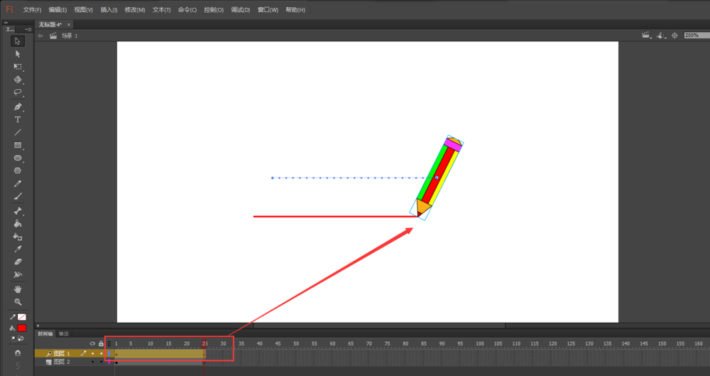 flash中想要去做一个用笔画出一条横线的动画,该怎么给铅笔添加画线条的动画呢?下面我们就来看看详细的教程。