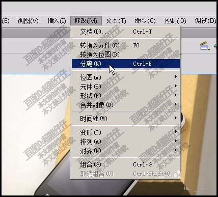 2、图片导出到舞台后,按下CTRL+B,执行分离命令,也可以点菜单可的修改,再点:分离。