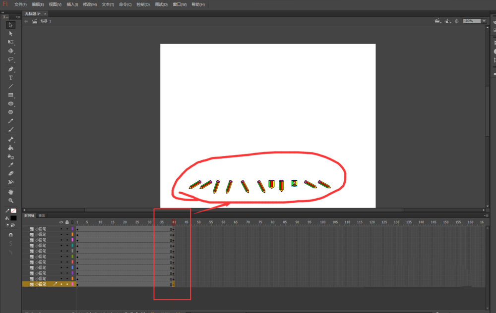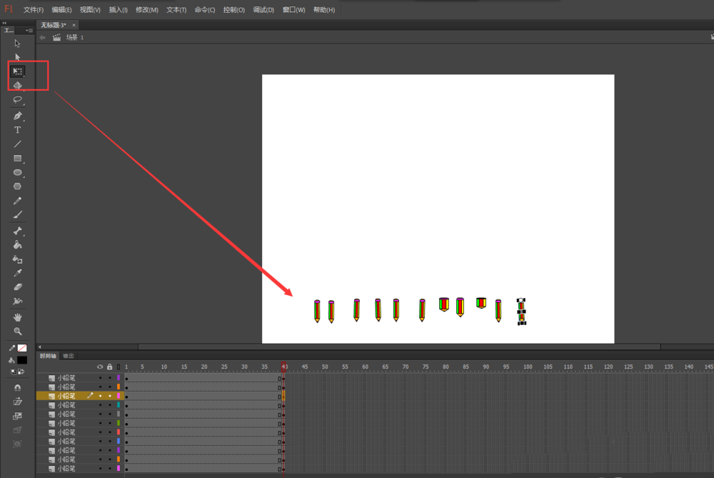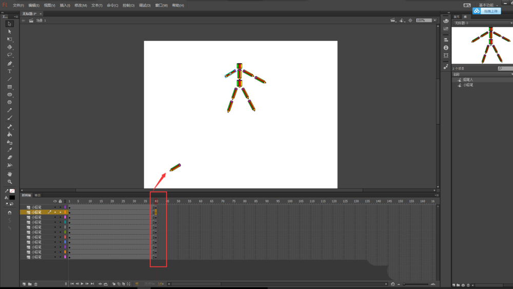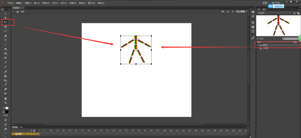 2、将我们之前的铅笔人元件直接拖入到场景画布中。然后选择任意变形工具,将铅笔人缩放到合适大小。