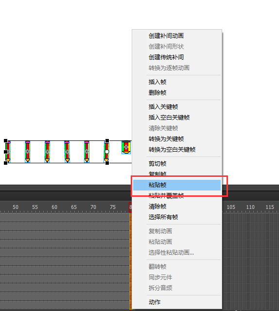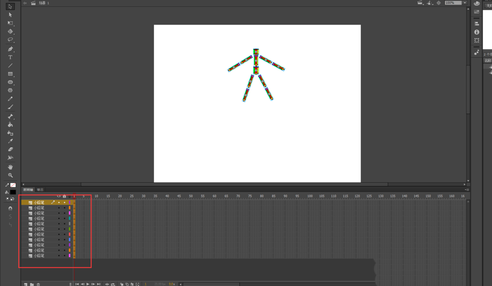 4、再次选中分离后的铅笔人,右键鼠标选择分散到图层命令,然后会看到在时间轴窗口中就多了很多图层,铅笔人的每个组件小铅笔都单独构成一个图层,现在原来的图层1就没有任何作用了,所以选中原来的图层1直接删除,只留下分散铅笔人到图层后的图层。