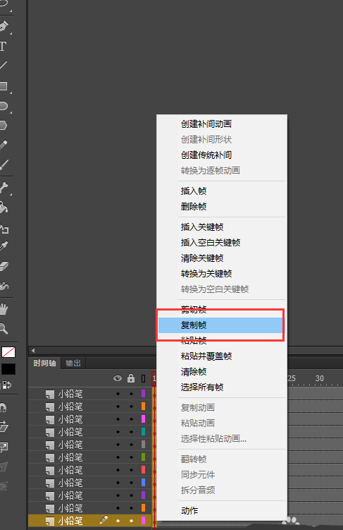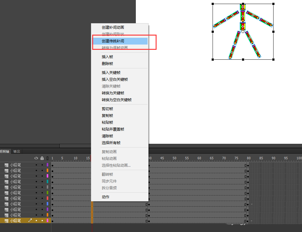 7、选中所有图层第1帧右键选择复制帧,然后在所有图层的第80帧处选择粘贴帧;然后在第1帧到40帧之间右键创建传统补间动画;在第40帧与第80帧之间也创建传统补间动画;回车测试动画,一个铅笔人分离又合成的动画效果就实现了。