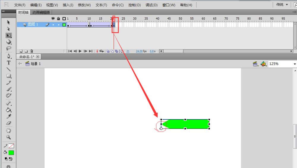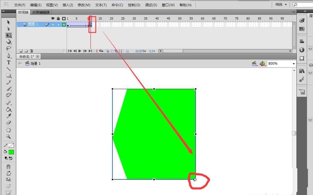 5、在时间轴第十一帧的位置创建一个关键帧,鼠标定位到第十一帧,这时候可以点放大键将画布放大,然后将矩形中心点在移到右下角的位置,再在时间轴第二十帧的位置创建一个关键帧,将矩形向左拉伸,长度拉大,宽度拉低,在第十一帧与第二十帧之间创建传统补间动画。
