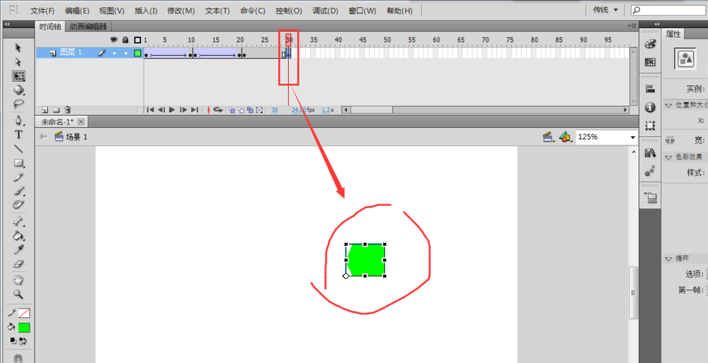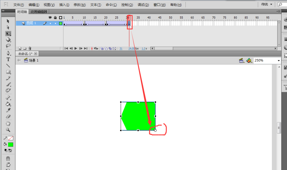 7、同理,在第三十一帧位置插入一个关键帧,将矩形的中心点移到右下角,在第四十帧位置创建一个关键帧,鼠标定位在四十帧的位置,将矩形拉长,宽度拉低,然后在三十一帧与四十帧之间创建一个传统补间动画。回车播放动画,一个像虫子爬动的动画效果制作完成了。