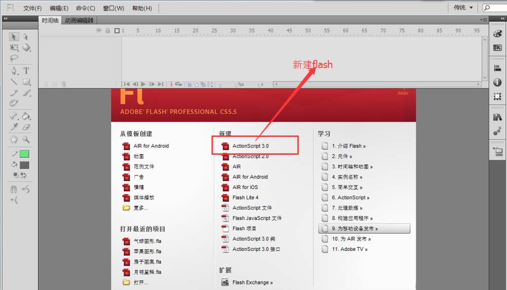 1、打开flash软件,点击新建一个flash动画项目。