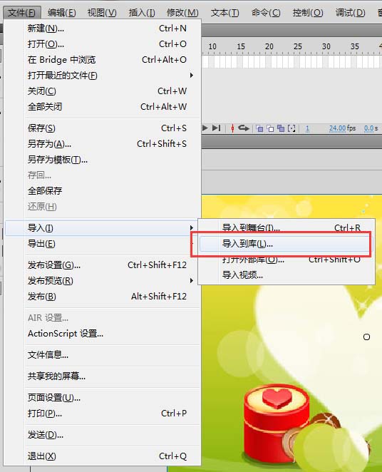 2、选择菜单栏中文件菜单,选择导入,导入到库,将我们的背景图片导入到flash库中,然后打开库窗口,将库中导入的图片拖入到场景中,选择任意变形工具,将背景图片素材调整到和场景大小一致。