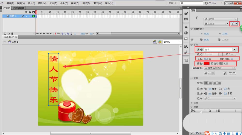 6、打开文本属性窗口,去调整段落文字的相应属性,比如说字体,大小,行间距等。调整到你觉得可以就行了。这样,我们就用flash做出了一个非常简单的情人节贺卡。
