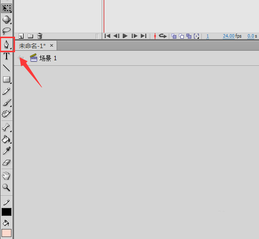 1、我们将flash这款软件打开,打开该软件之后再在工具箱内找到钢笔工具,如图所示: