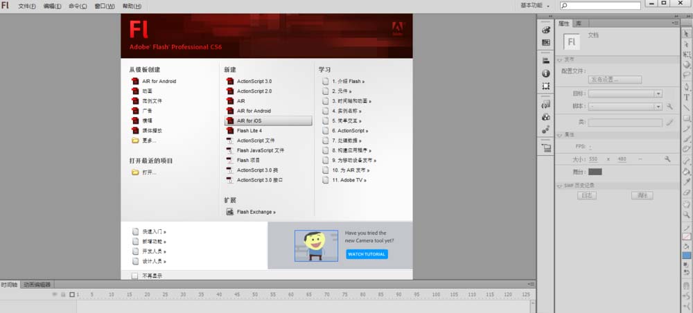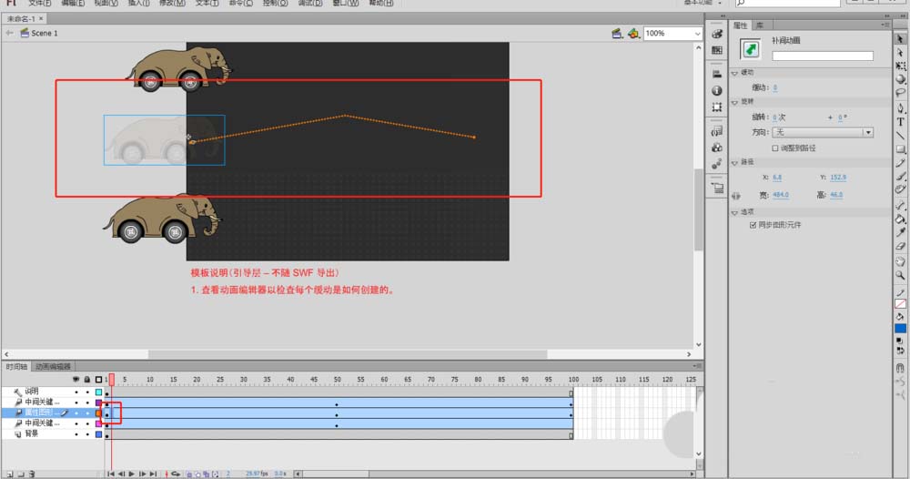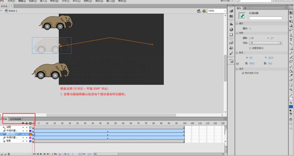 3、创建动画成功后,熟悉Flash操作面板。一些工具的位置,资源的位置,时间轴,动画编辑器等。