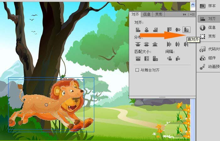 6、最后,可以看到画布中的卡通动物图形,底部的边框对齐了,如下图所示。在游戏测试中会经常使用对齐工具,来辅助对齐图形,喜欢制作游戏和动画的朋友们也来做做吧。