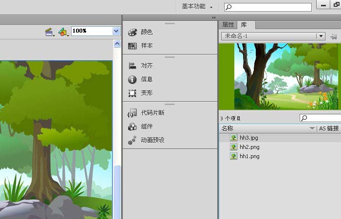2、接着,导入素材图片到库,把库中的素材图片,通过鼠标的操作,拖放到画布上,摆放好图形的位置,比如卡通深林图,作为背景图,如下图所示。