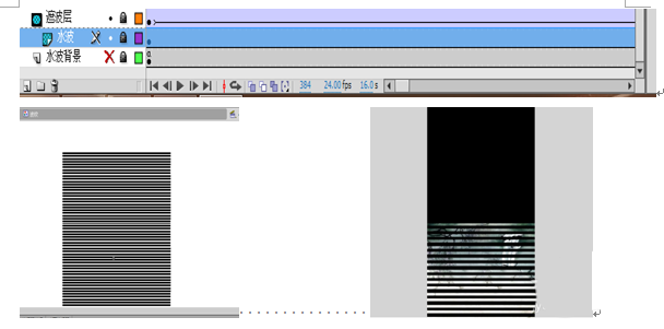5、建立遮波层,新建图形元件波纹,将其拖入到遮波层中,在第其676帧处,插入关键帧,在676帧将其进行位移,创建传统补间动画,再将其设置为水波层的遮罩层,具体如图: