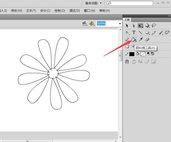 1、首先,打开Flash CS4,如图先画好要进行填充色彩的形状。再点击工具栏上的颜料桶工具。